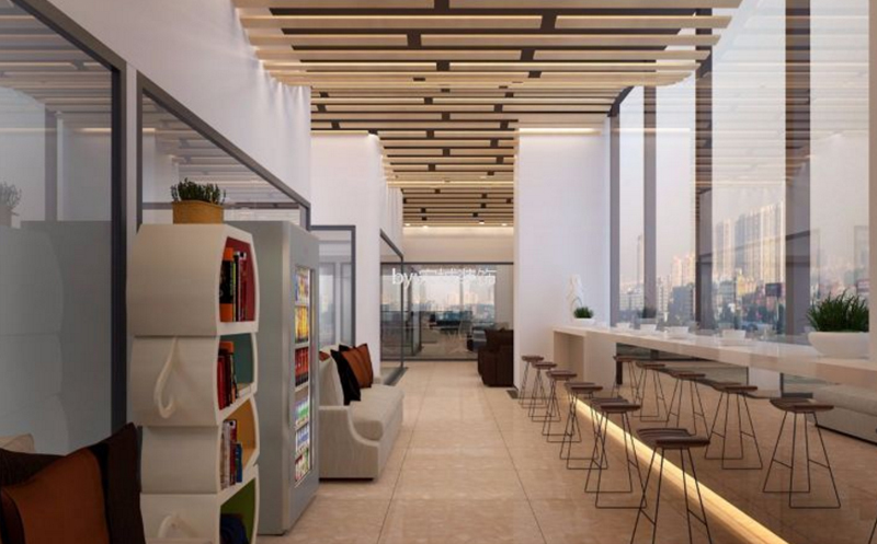 3、创意办公室隔断上可以采用透明玻璃隔断,可以增加室内的通透性,一些接待区,茶水间的设计上可以以舒适为主。