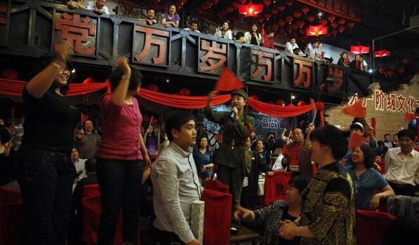 今天装修网小编带大家来参观一下北京的一家“红色经典餐厅”,即1976主题餐厅装修设计。一位打扮成红卫兵模样的服务员走过已故毛泽东主席的肖像。1976主题餐厅是一家基于发生在1966年至1976年中国文化大革命的主题餐厅。餐厅装饰着那时期的海报,服务员打扮成当时的红卫兵,表演文革时期的歌曲和舞蹈。